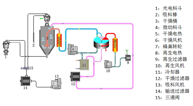 → 干燥除濕部分:從干燥料桶回來的濕熱空氣經冷卻,吹入蜂巢轉輪。空氣中的水分被轉輪吸附,然后又被再生加熱空氣所脫附。兩股氣流同時作用在轉輪上,并隨著轉 輪的轉動,使得空氣中的水分連續不斷的被吸附又被再生空氣所脫附而排出,就形成穩定的低露點空氣,經加熱到塑膠的干燥溫度,吹入干燥料桶內,形成密閉循 環,干燥原料。